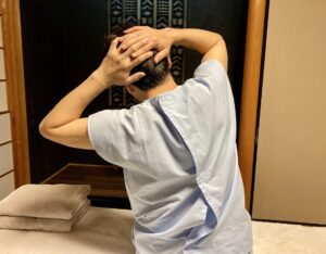 関節調整鍼を手に行い写真のような動きで確認していただくと